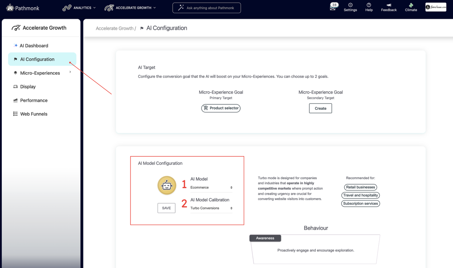 Pathmonk’s AI mode is a strategic setting that adapts our personalization algorithm to your specific business model and conversion logic. It tells the AI what type of growth strategy your website follows, so it can prioritize the right actions, journeys, and decision paths for your visitors.