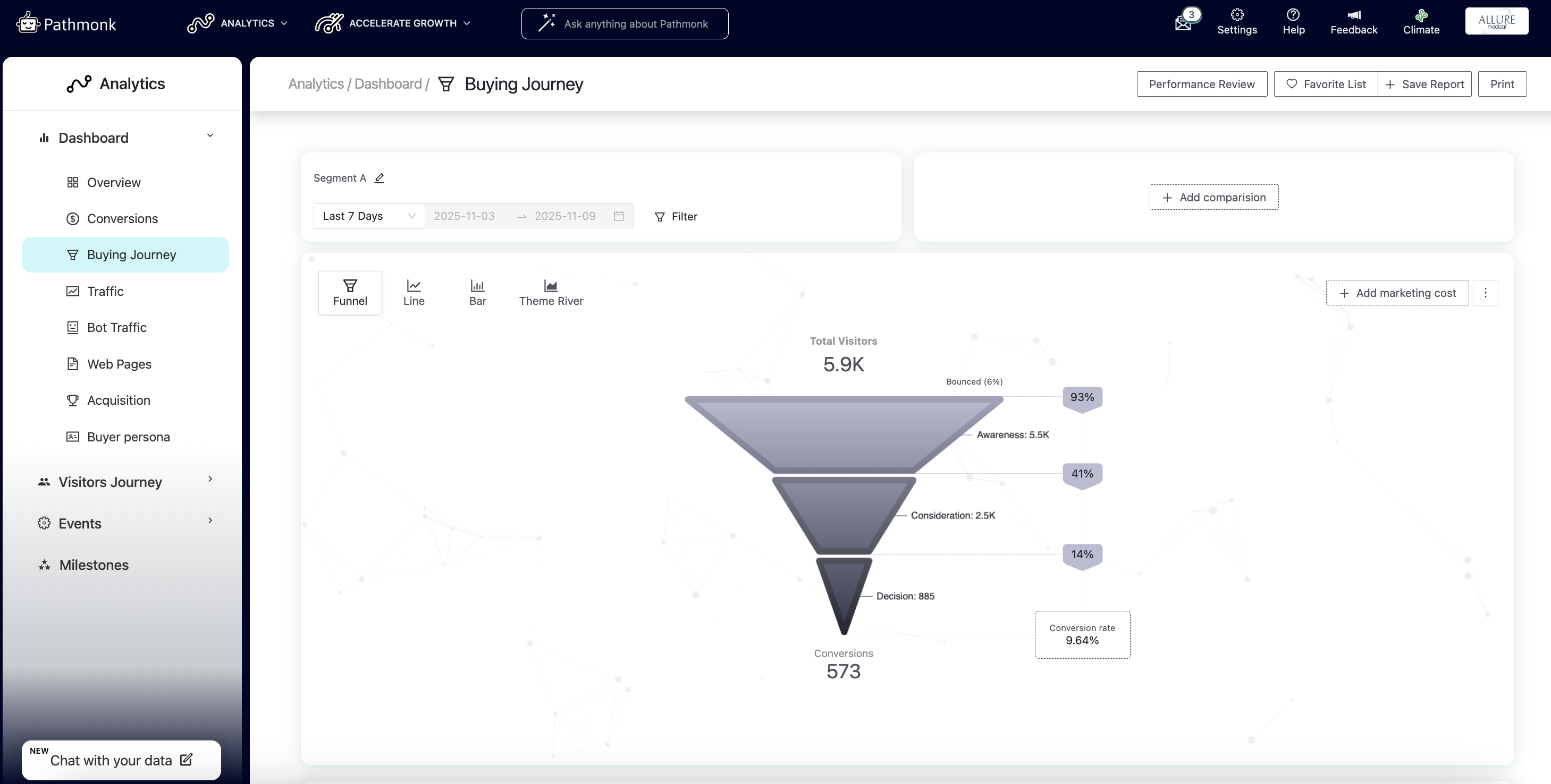 Performance Review → enables the double funnel view used for A/B testing. This allows you to directly compare performance with and without Pathmonk personalization. Learn more about how to check your Pathmonk results.