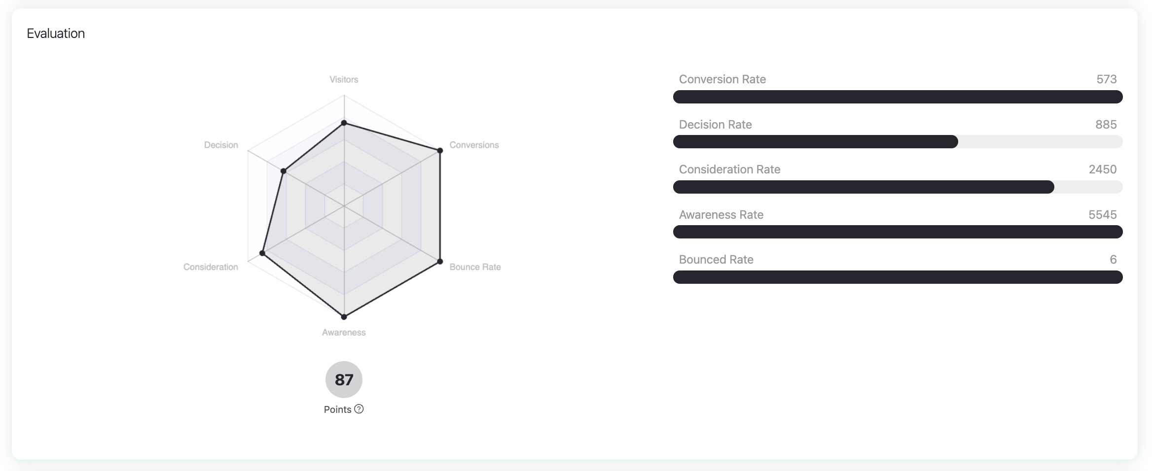 These metrics are displayed both as numerical values and in a radar chart, giving you a visual sense of how balanced your buying journey is. The Points score summarizes overall journey health at a glance.