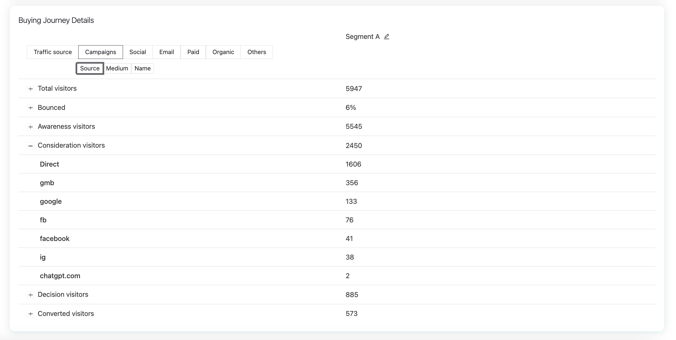 Within Campaigns, you can also view data by source, medium, or name, to understand how visitors behave across stages (awareness, consideration, decision, and conversion).