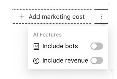 Include bots / Include revenue toggles → under the three-dot menu, you can choose whether to display bot traffic and revenue data in your report.