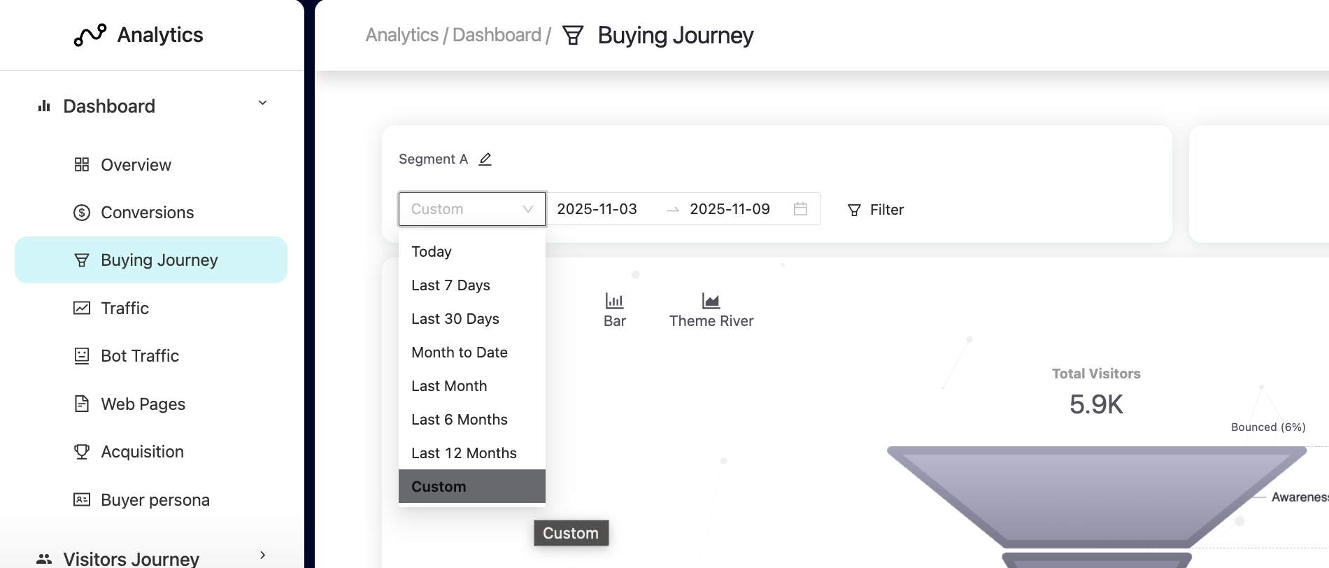 The Buying Journey report gives you a complete view of how visitors move through your website, from awareness to conversion. It’s one of the most useful reports in the Analytics section, helping you understand where users drop off, how many reach each stage of the journey, and what your overall conversion rate looks like.