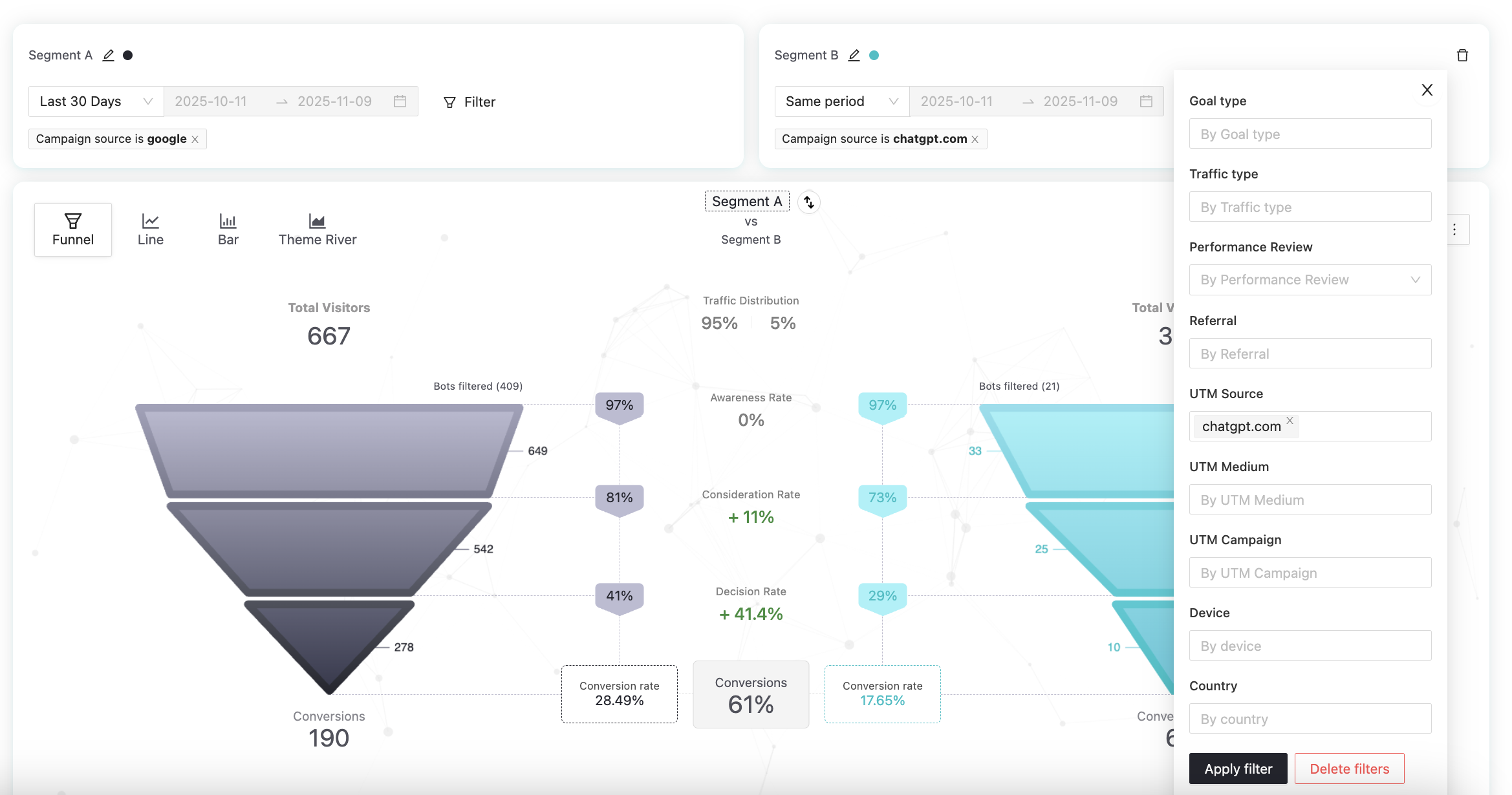 To do this, define Segment A and Segment B at the top of the page. In the example below, we're comparing the traffic for the last 30 days coming from their Google campaigns to that coming from ChatGPT.