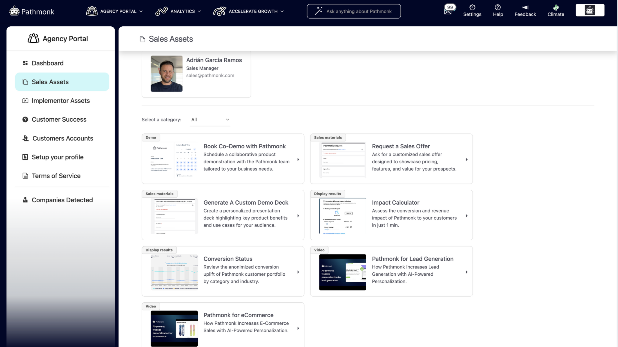The Sales Assets section is your library for continuous learning and sales enablement. It includes step-by-step tutorials, sales guides, and materials that cover every stage of your Pathmonk journey—from booking a demo to presenting offers to prospects.