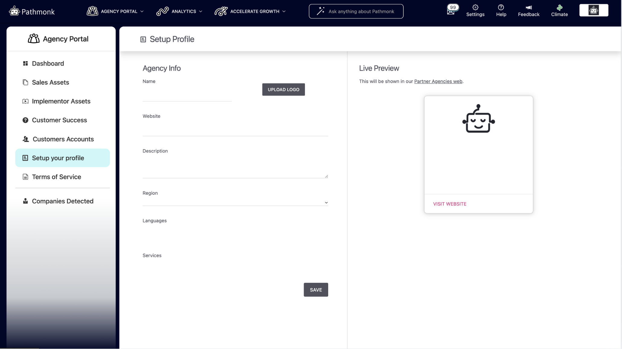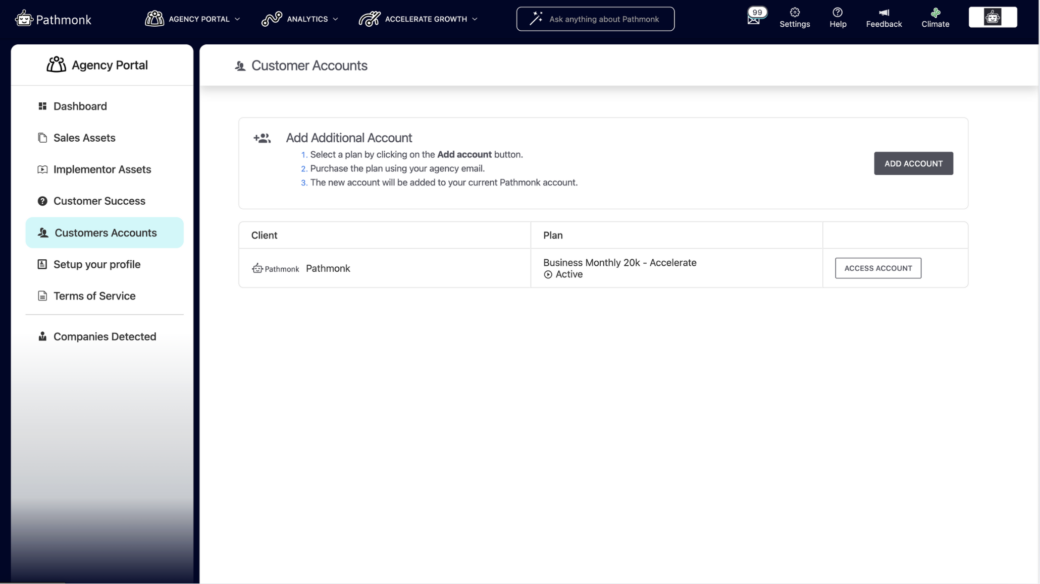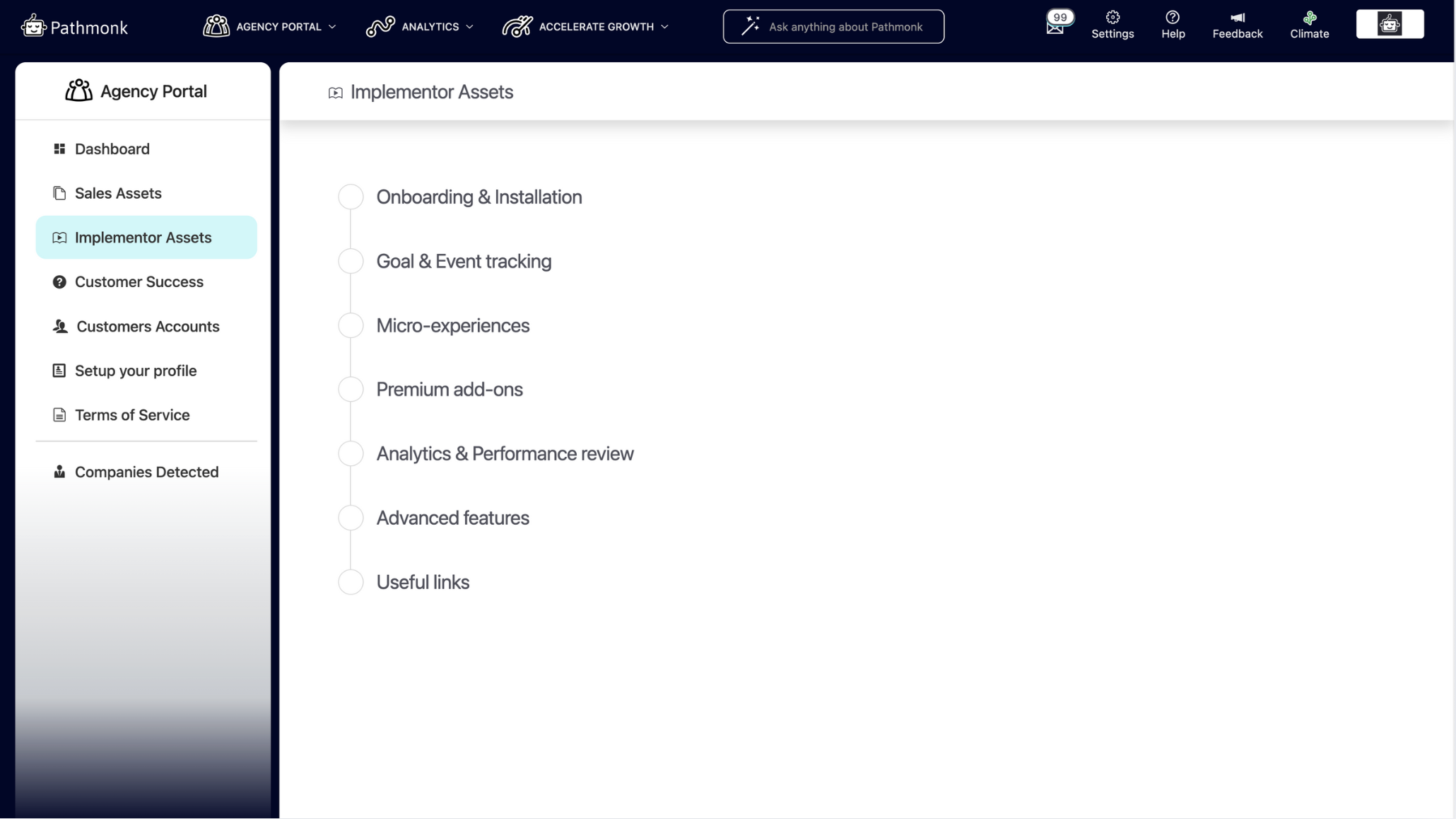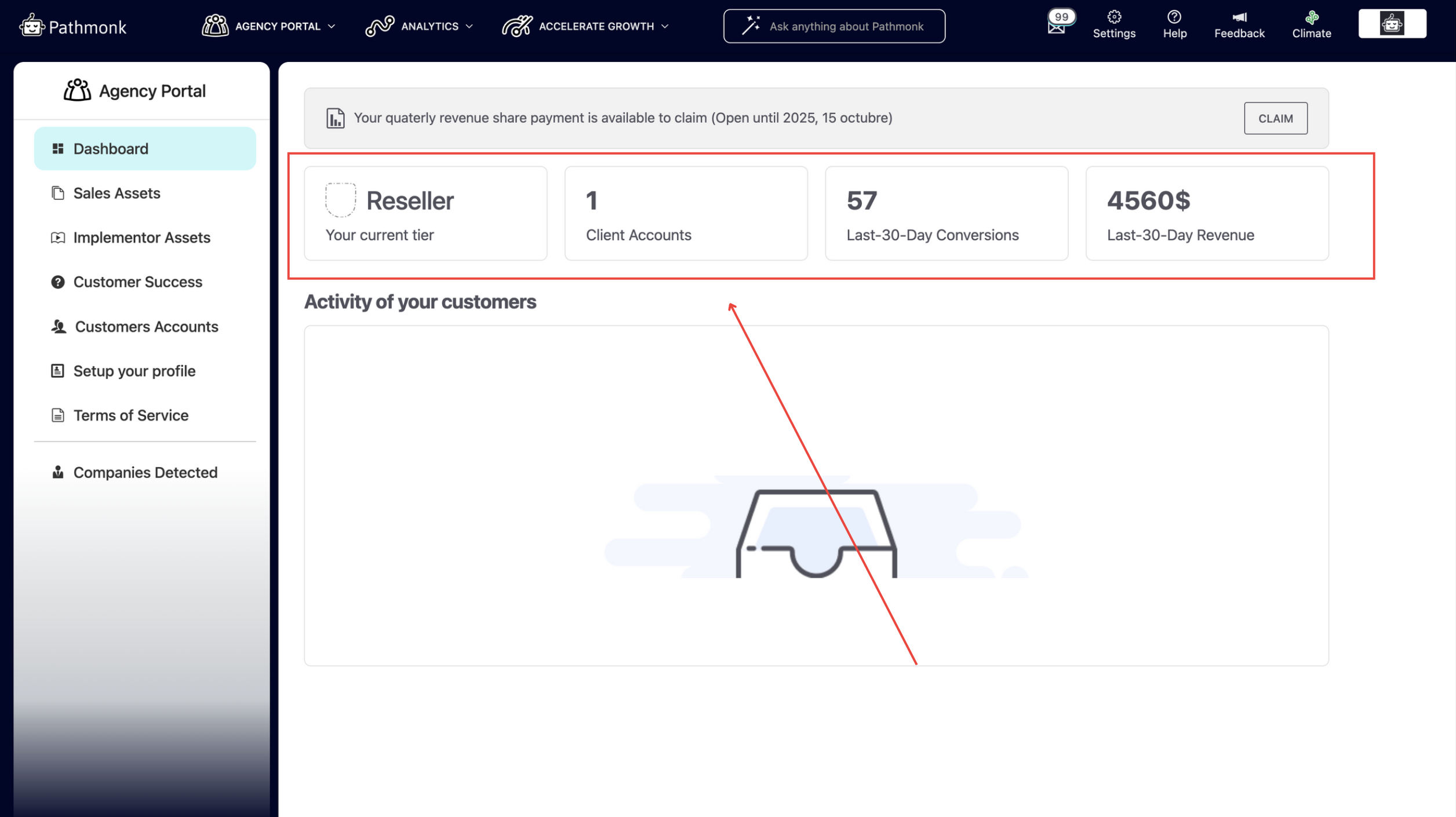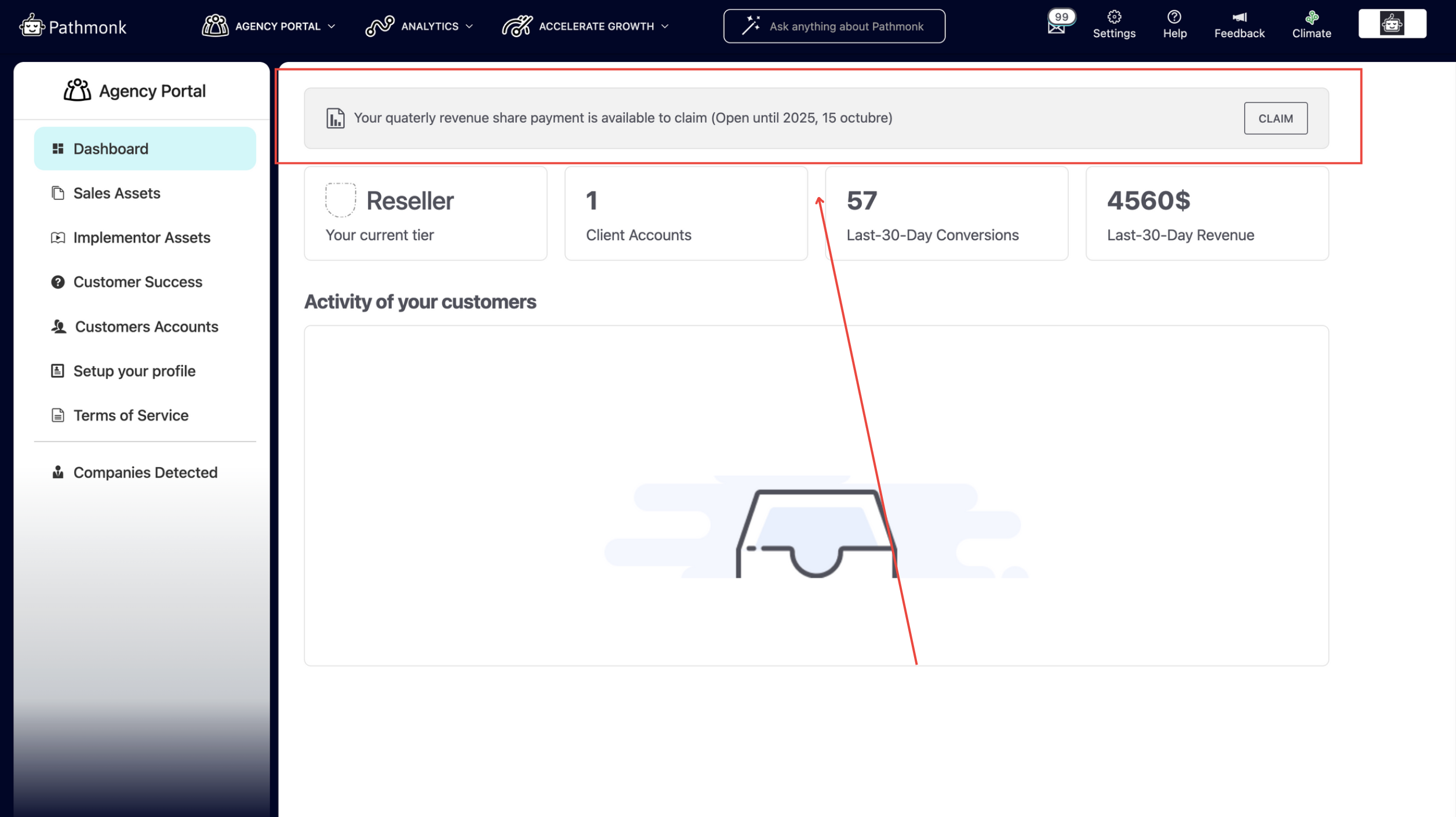 The Agency Portal (only enabled for our agency partners) is your gateway to onboard and manage clients, claim commissions, track performance, access resources, and handle all aspects of your partnership with Pathmonk.
