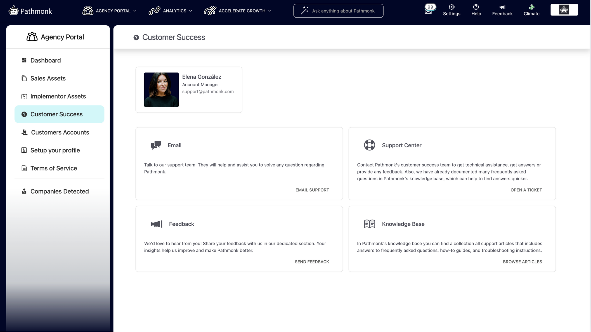 Within Customer Success, agencies can find support and collaboration options with Pathmonk’s internal teams. This section lets you report issues, suggest new features, and access troubleshooting guidance.