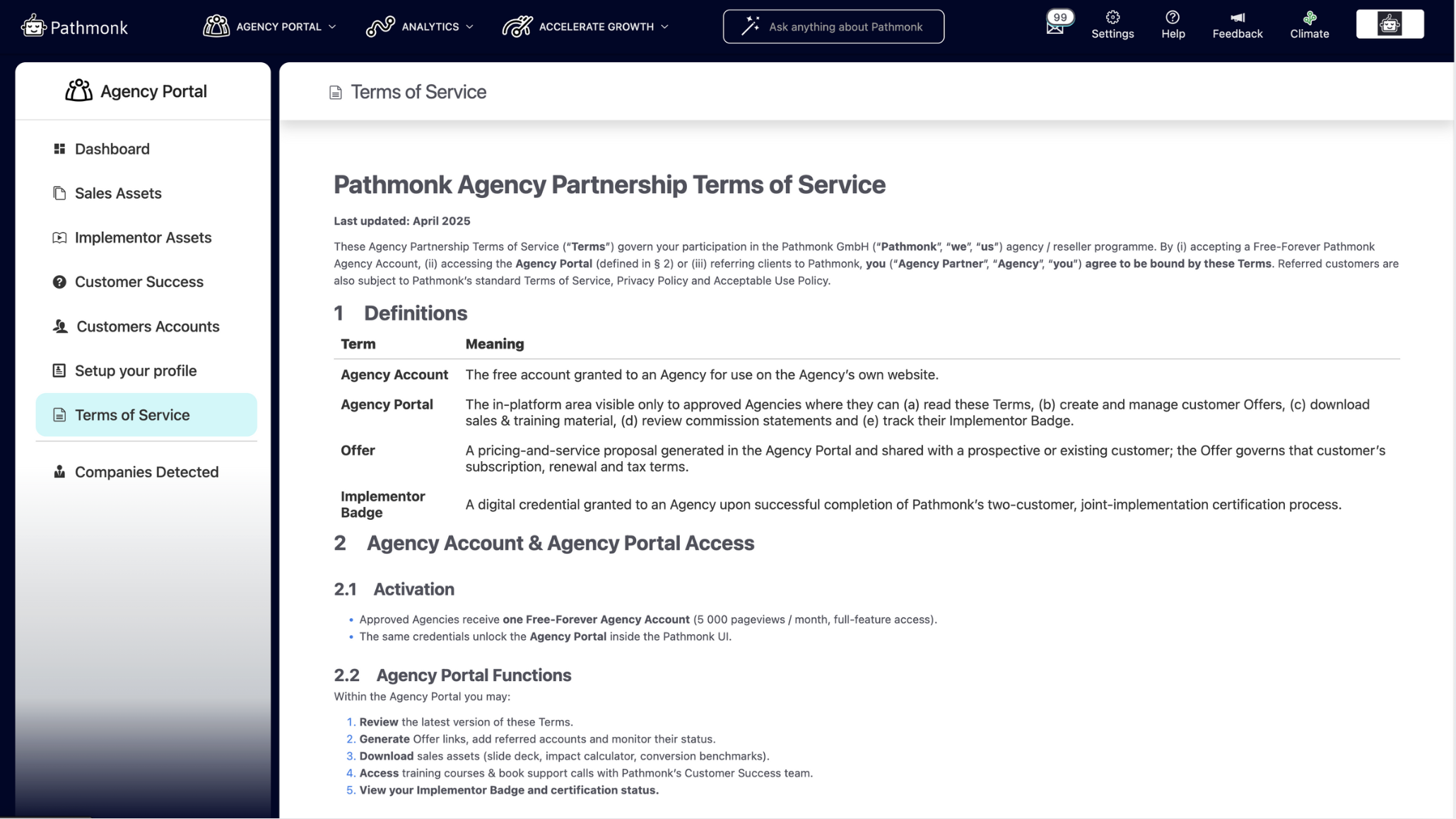 In the Terms of Service, you’ll find all contractual details regarding your Pathmonk agency license. This section is where you can review the terms, rights, and obligations that govern your relationship with Pathmonk. It’s recommended to revisit this area periodically to stay informed about your compliance a+in your partnership agreement.