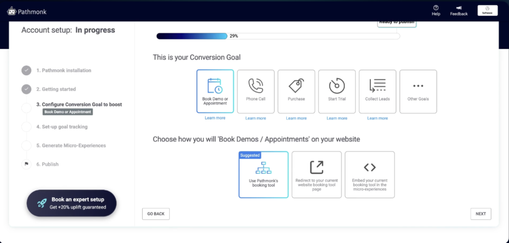 Once installation is verified, you’ll define how Pathmonk should help you reach your conversion goal.