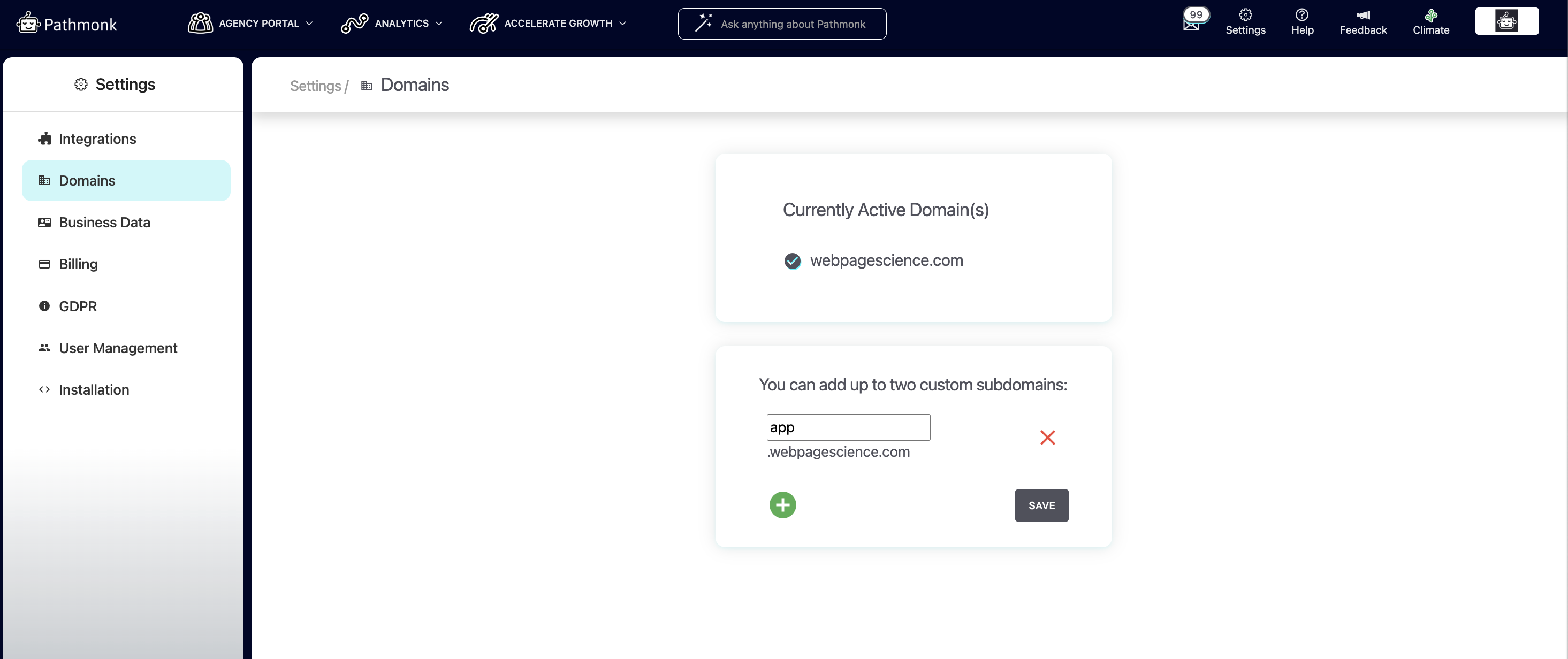 If you need to connect more than two subdomains (or special environments like a staging or sandbox domain), please contact support@pathmonk.com — our team will review your case and help with the setup.