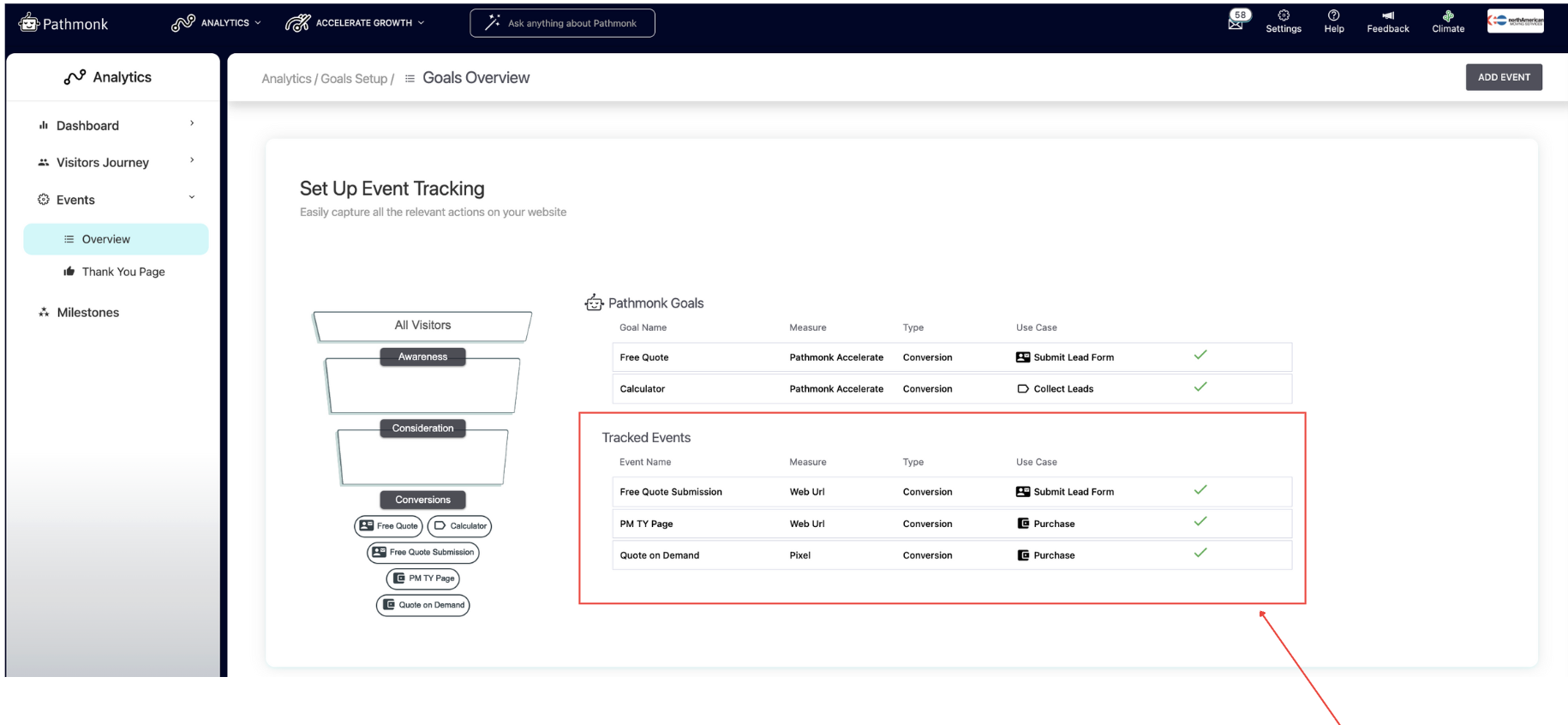 Every goal should have an associated tracked event. This allows Pathmonk to understand not only whether visitors are reaching your goals, but also if they are actually converting.
