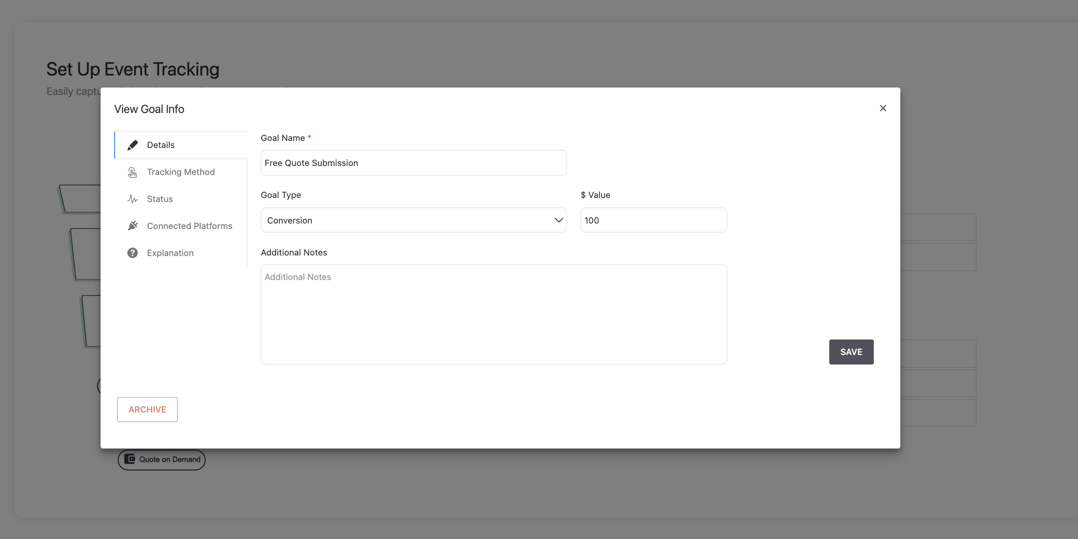 Goal name: The internal name of your event (e.g., “Free Quote Submission” or “Purchase”).