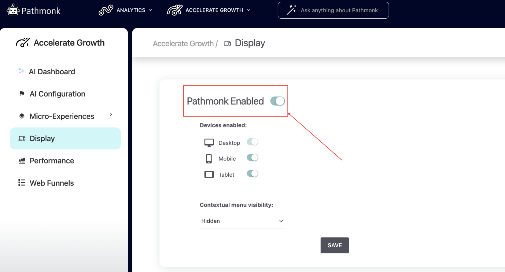 If you simply want to pause the microexperiences on your website but continue collecting analytics, you can disable all micro-experiences directly in your Pathmonk account.