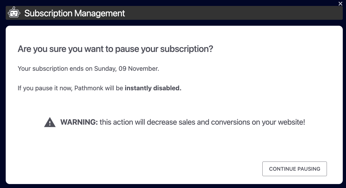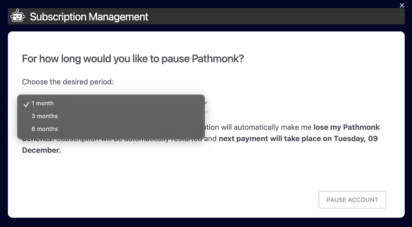 You can pause your Pathmonk subscription for 1, 3, or 6 months.