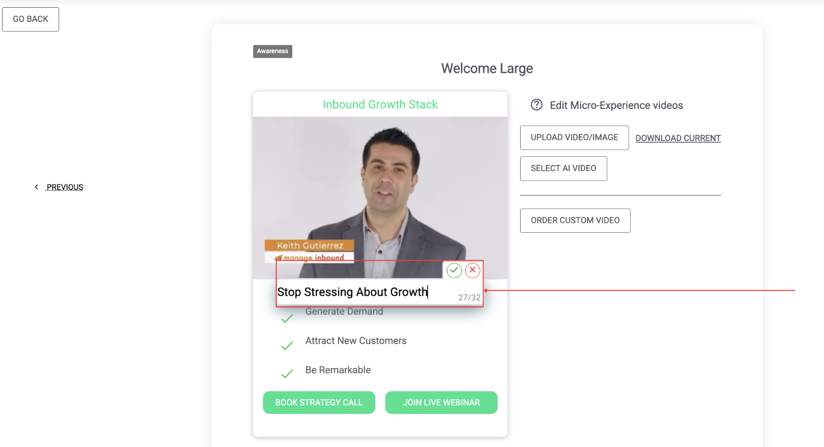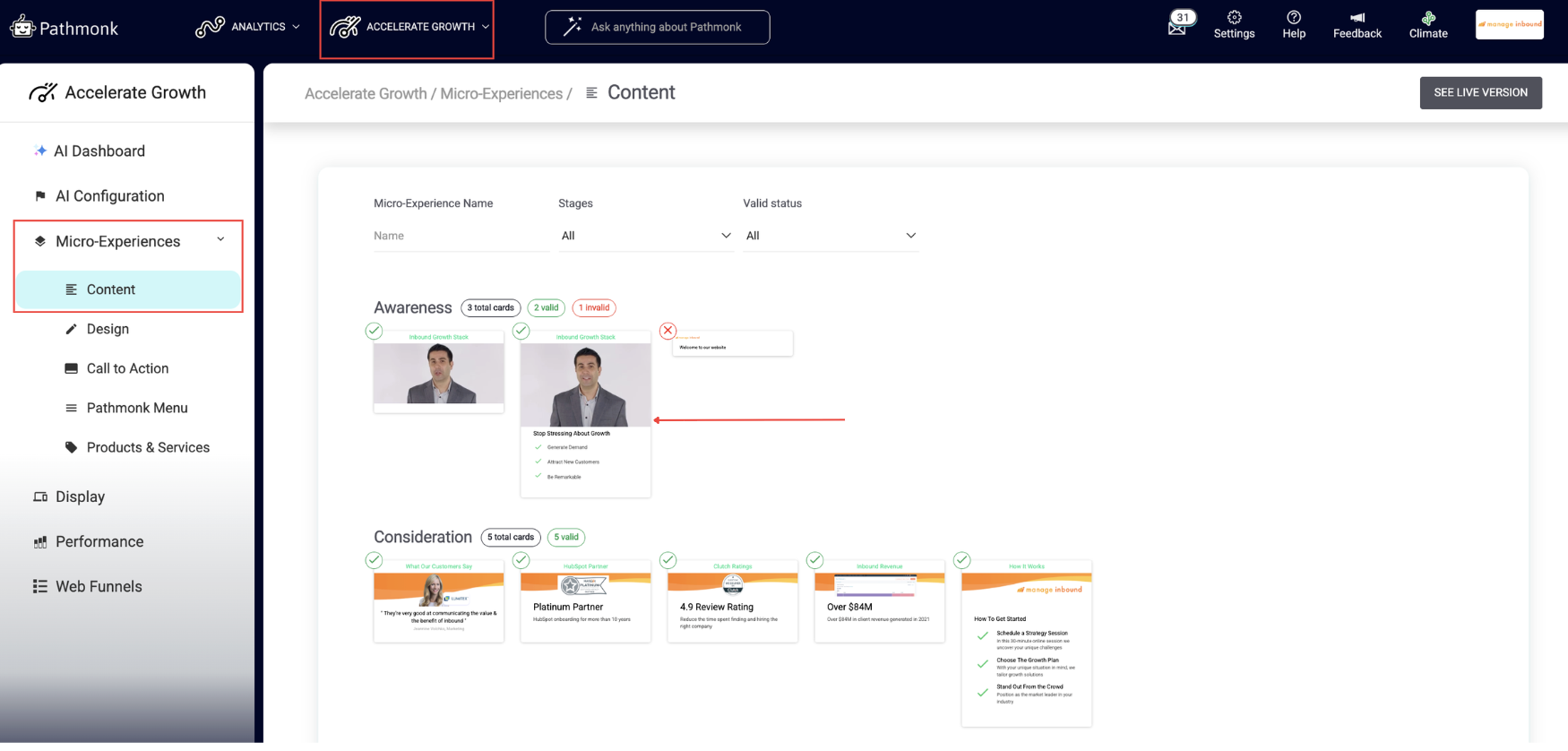 Follow the same steps and go to your Microexperiences > Content tab. Then, click on any of the Awareness cards to edit directly.