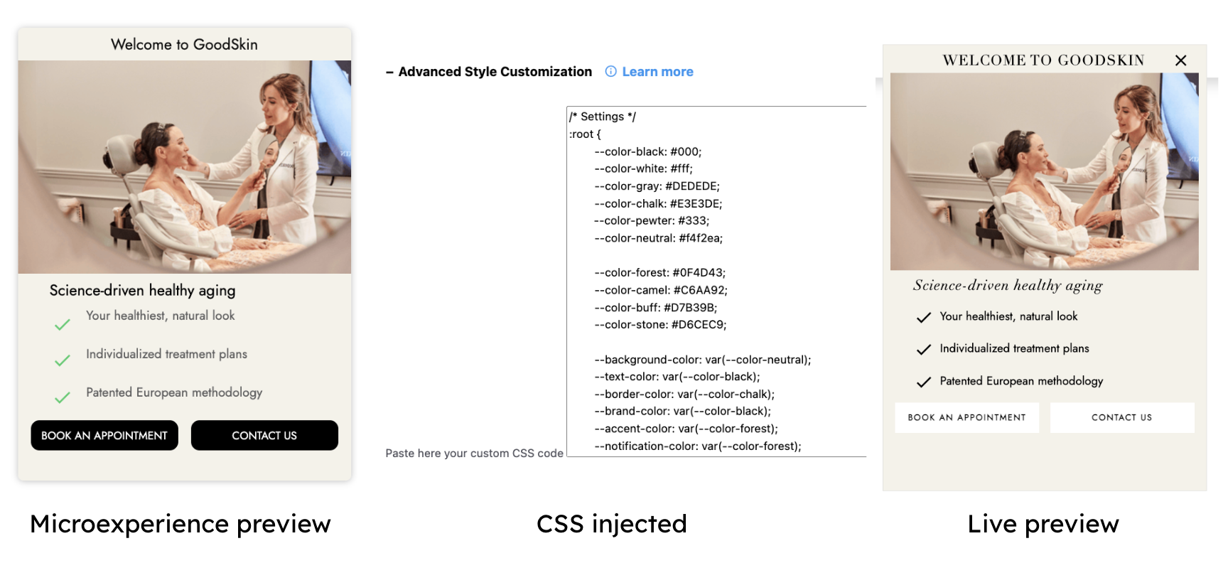 You can edit text, images, or videos directly inside the microexperience editor. However, if you’ve added custom branding via CSS, the editor preview won’t reflect those visual changes.