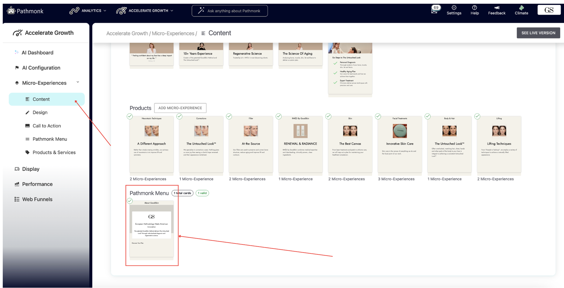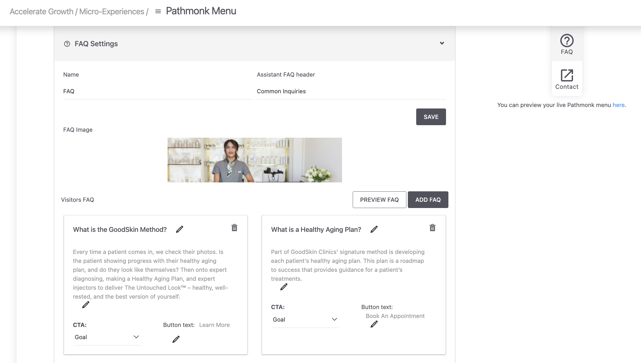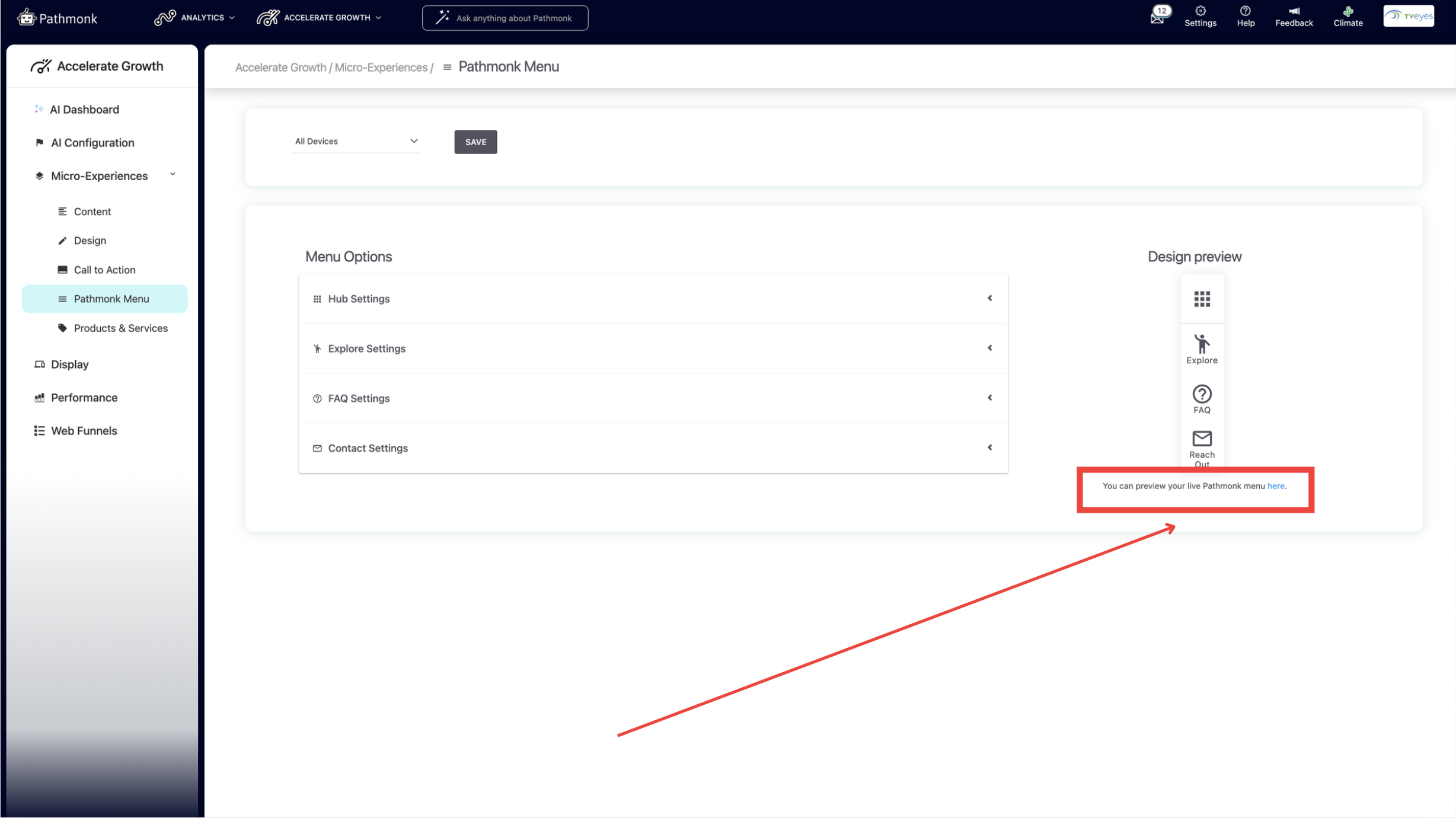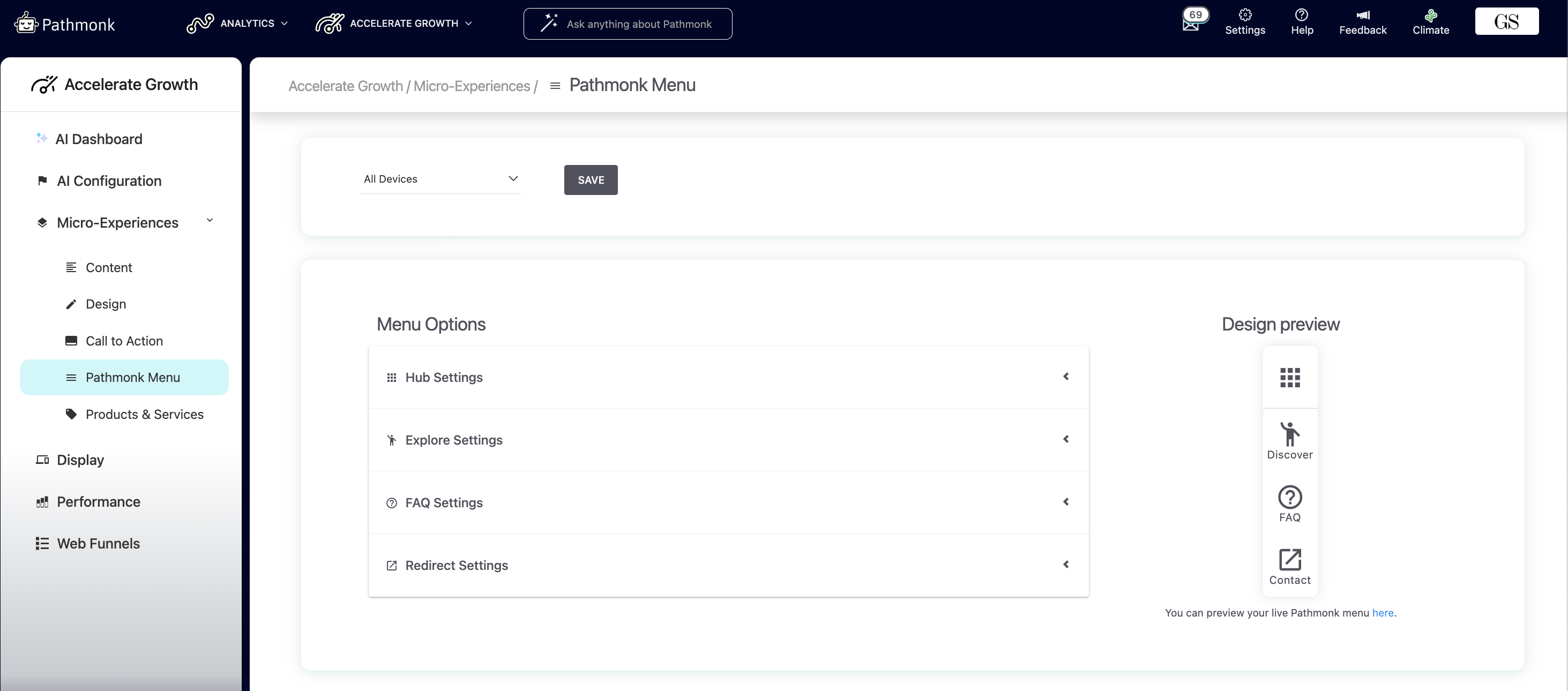 To configure the menu, go to: Accelerate Growth > Micro-Experiences > Pathmonk Menu. Each tile can be edited individually.