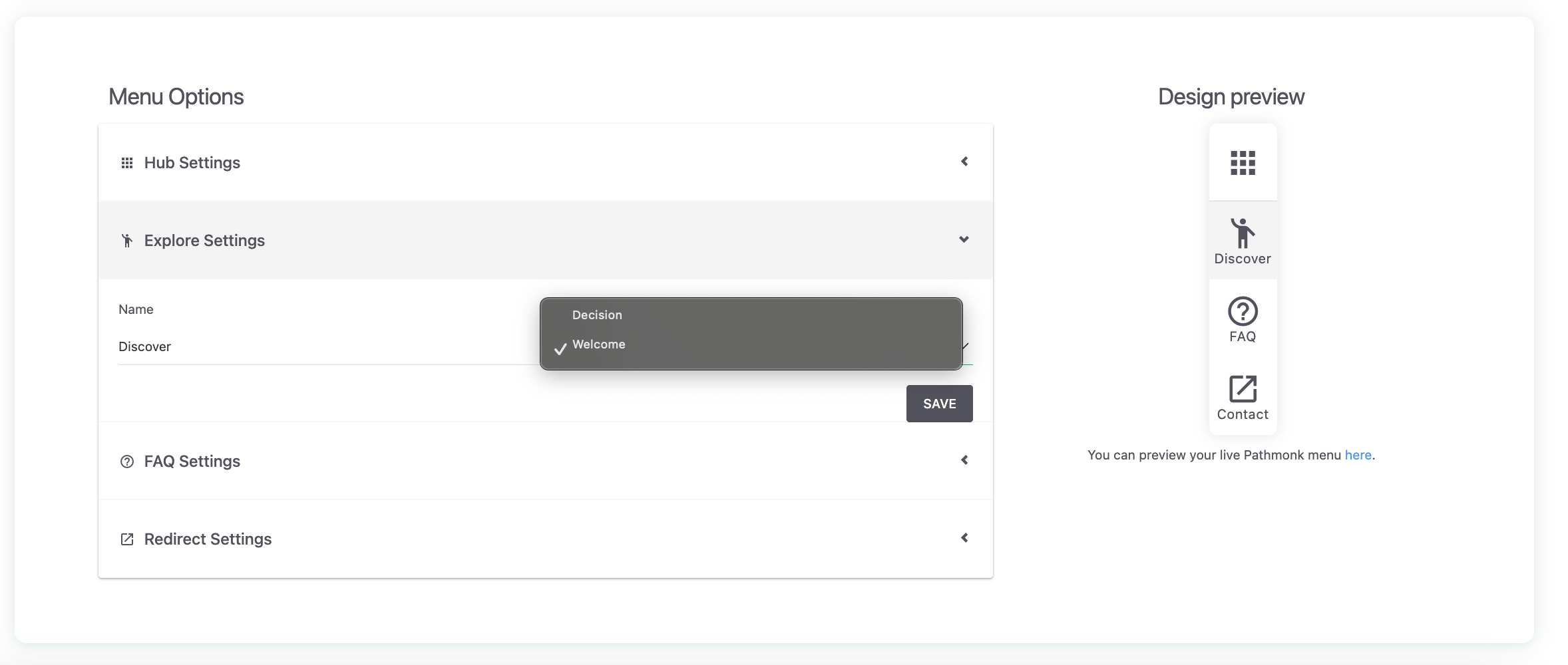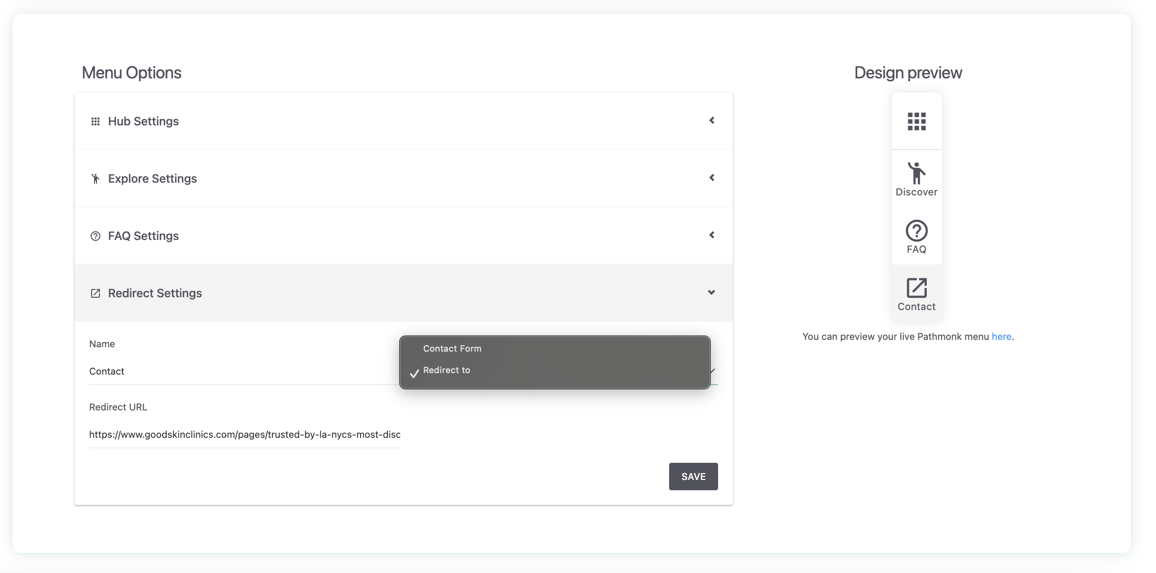 Before pushing changes live, you can see exactly how the menu will look. Click the preview button inside the Pathmonk Menu section. Then, select to preview the Pathmonk menu to trigger it on the right side of your screen.