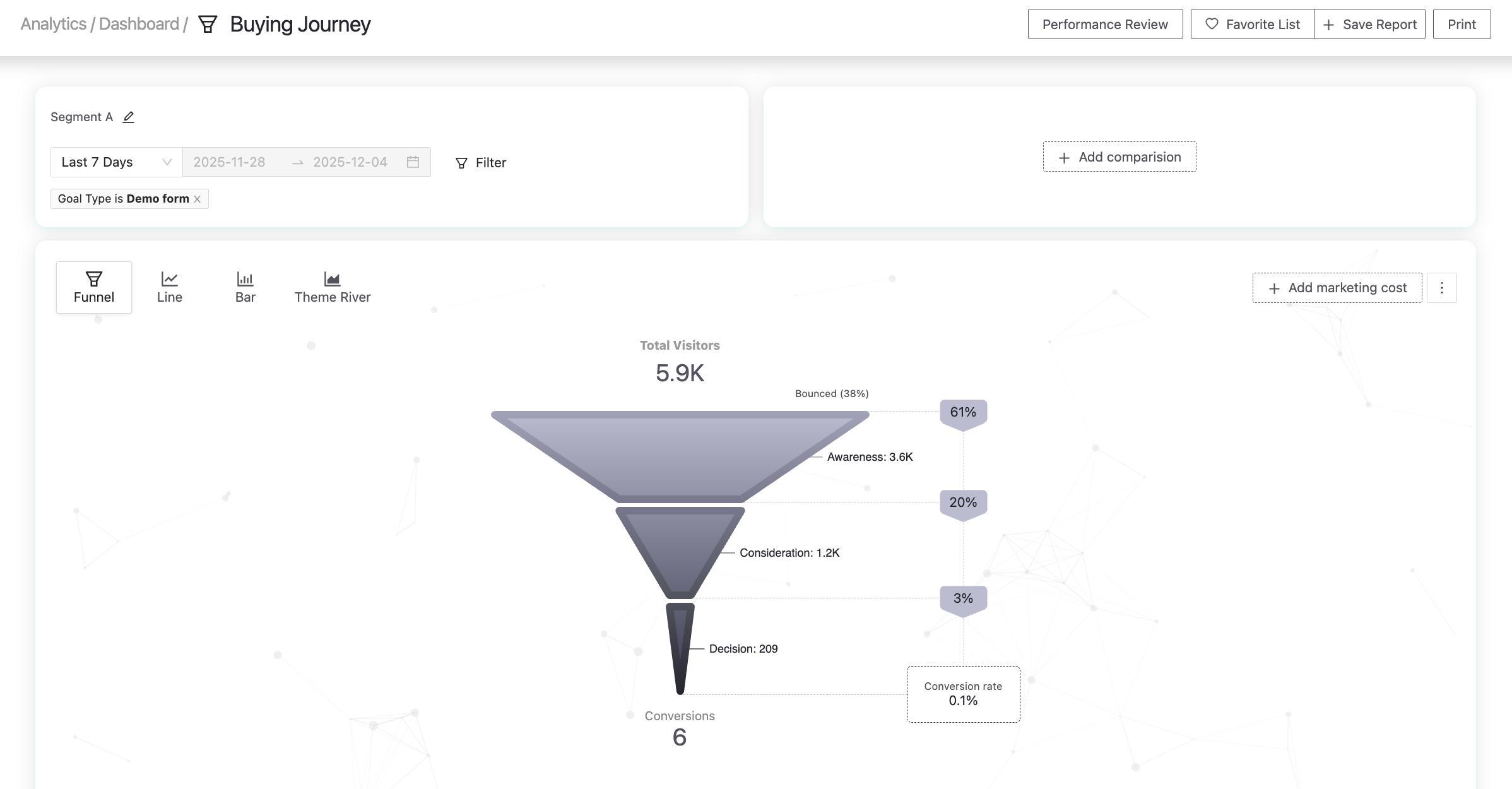Before hitting on "Performance Review" we see a total of 5.9 K visitors and 6 conversions.