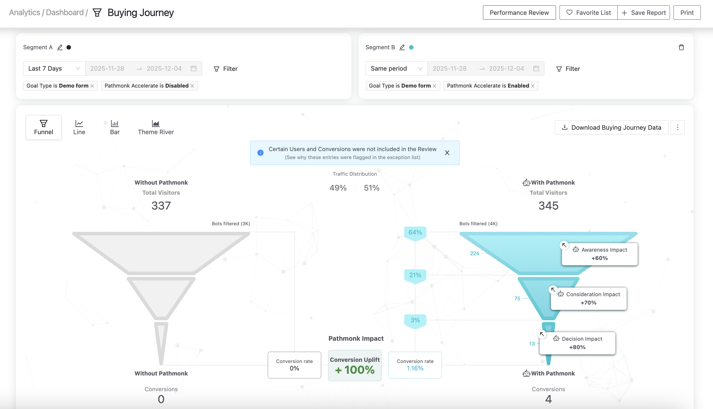 In some cases, you might see that the Buying Journey or the Conversions report show a total amount of visitors or conversions, and when you click on Performance review, those numbers suddenly change. The exposed vs. non-exposed segments don’t add up to the original totals, which can look confusing at first.