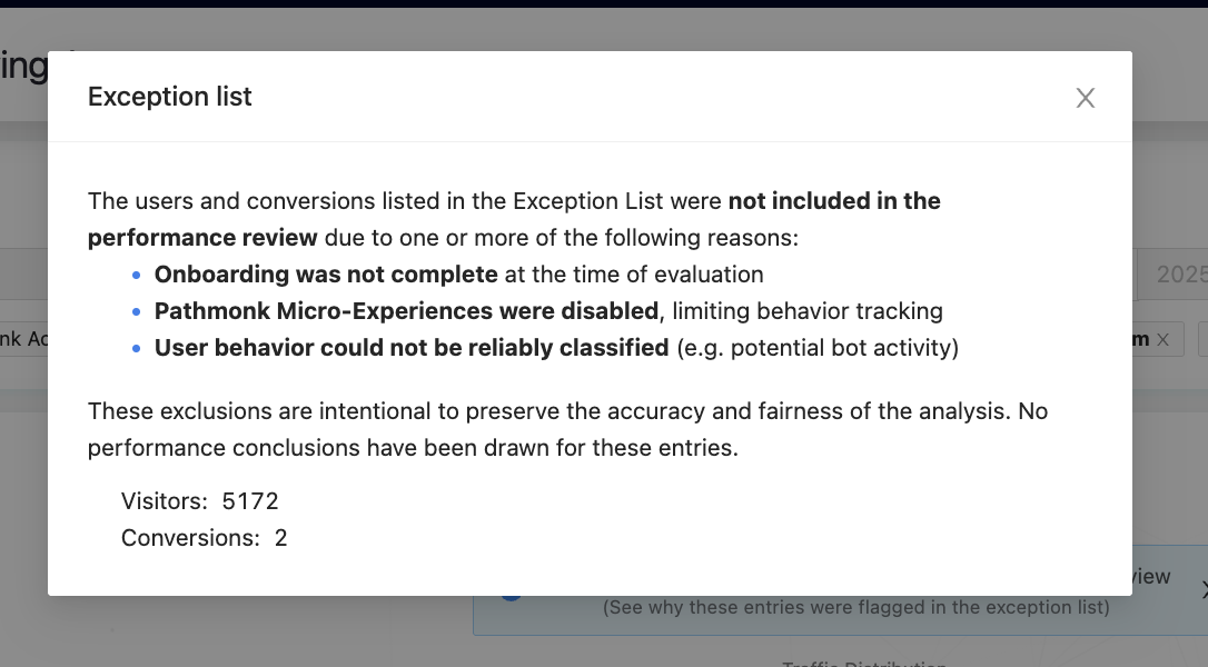 So during any period where microexperiences are disabled Pathmonk can still track visits and conversions but it cannot reliably classify those users into “exposed” or “non-exposed”. As a result, those sessions are excluded from the A/B breakdown.