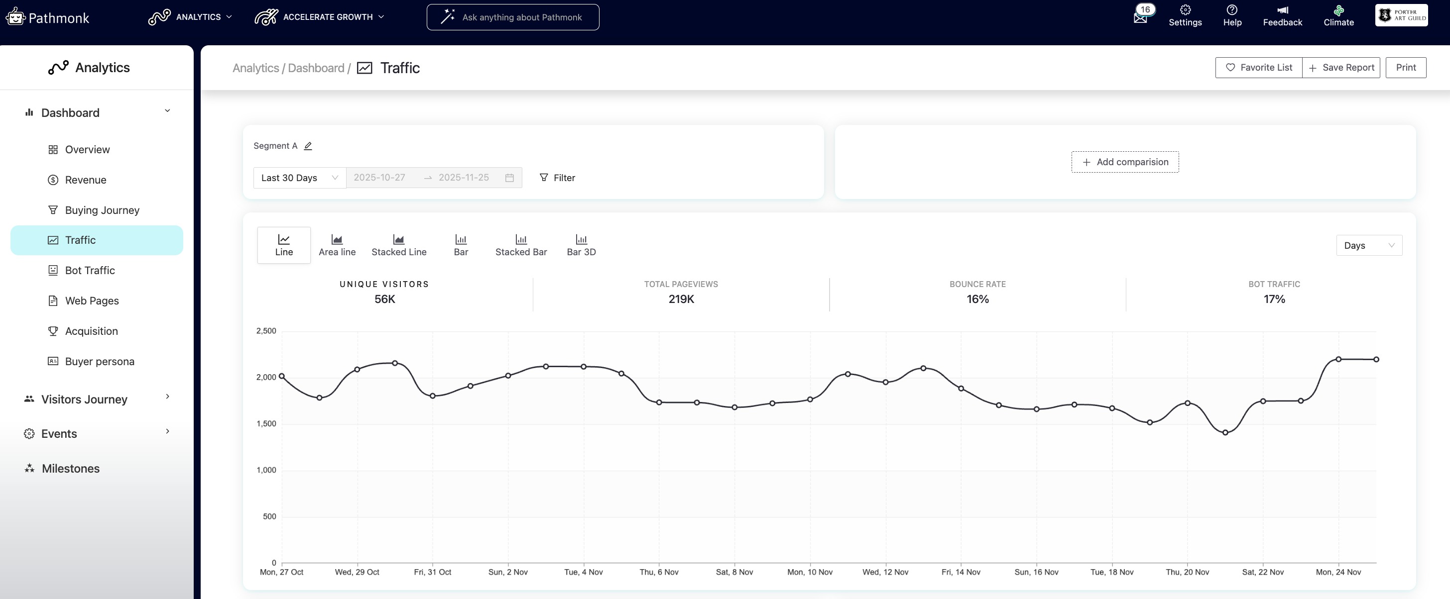 The report also supports comparing two segments side by side, as in the example above. When you enable a comparison, Pathmonk displays a second segment with its own date range and filters. This allows you to compare traffic types (for example, Organic vs Paid), different weeks, or two audiences. The chart will display both lines so you can easily see shifts in traffic volume, pageviews, and bounce rates across the two segments.