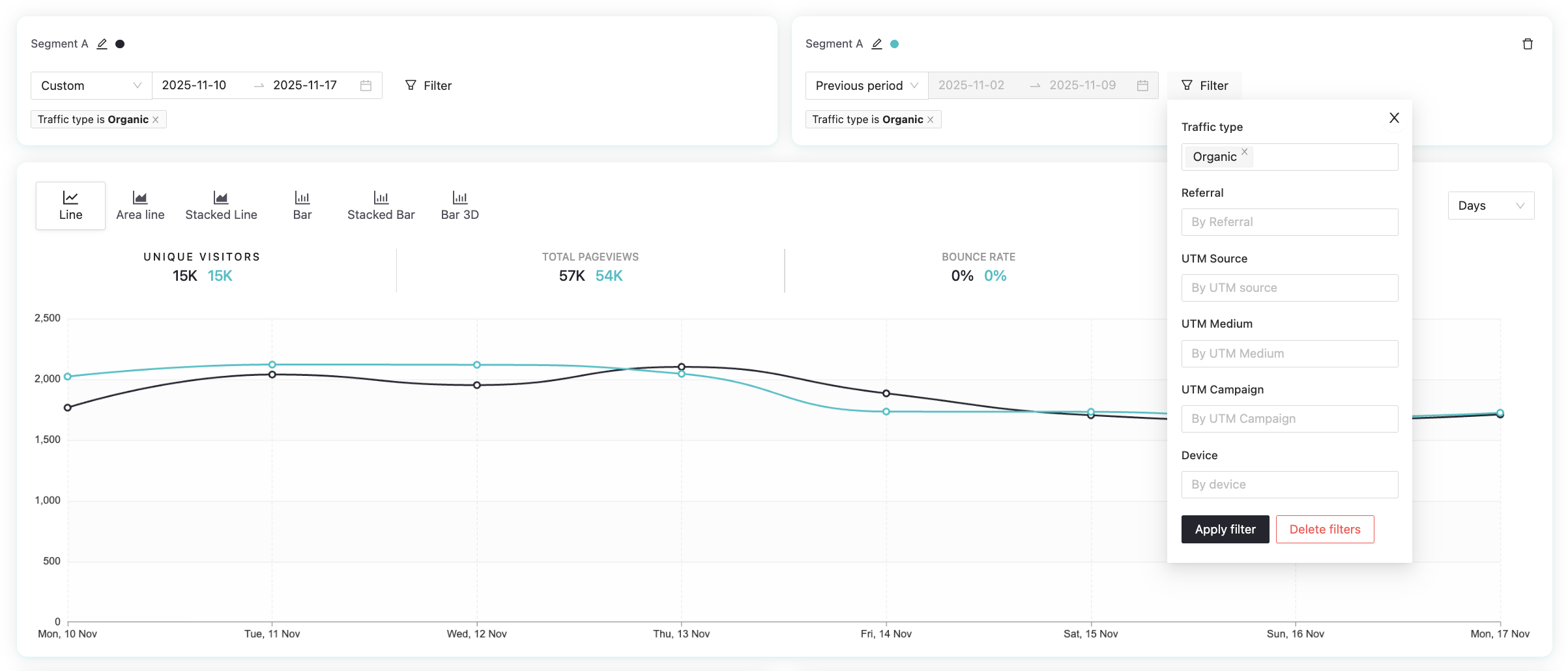 You can also apply filters to narrow the traffic you’re analyzing. The filter panel lets you refine by traffic type, referral, UTM source, UTM medium, UTM campaign, and device. Once you select your criteria, click Apply filter. To return to the default view, use Delete filters.