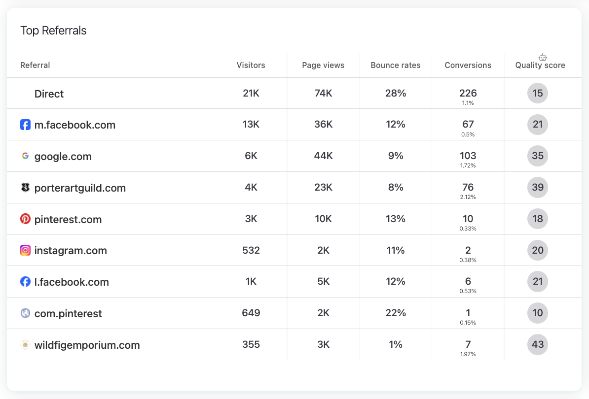 Use this section to identify which external domains bring the most engaged visitors and which sources may need attention. For example, you might notice that exampleblog.com sends fewer visitors but has an outstanding conversion rate, meaning it could be a high-value partnership opportunity.