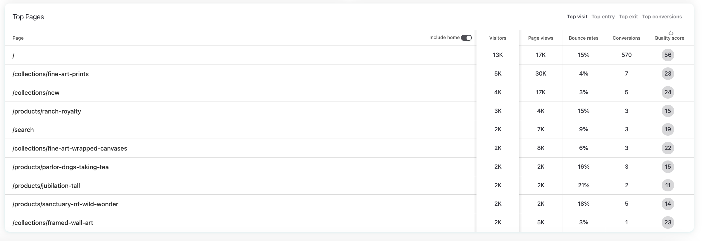 Since the homepage often dominates traffic metrics, there is also an “Include Home” toggle.