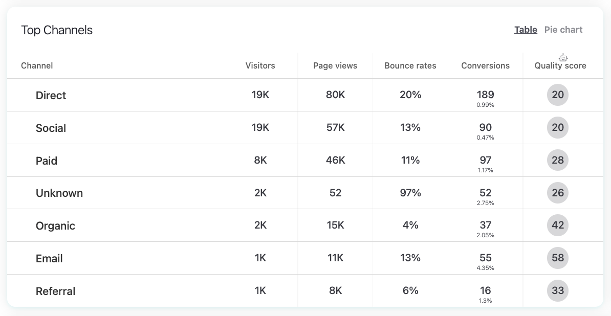 This section shows which channels bring the most engaged users and which ones contribute most to conversions. You can switch between a Table view and a Pie chart.