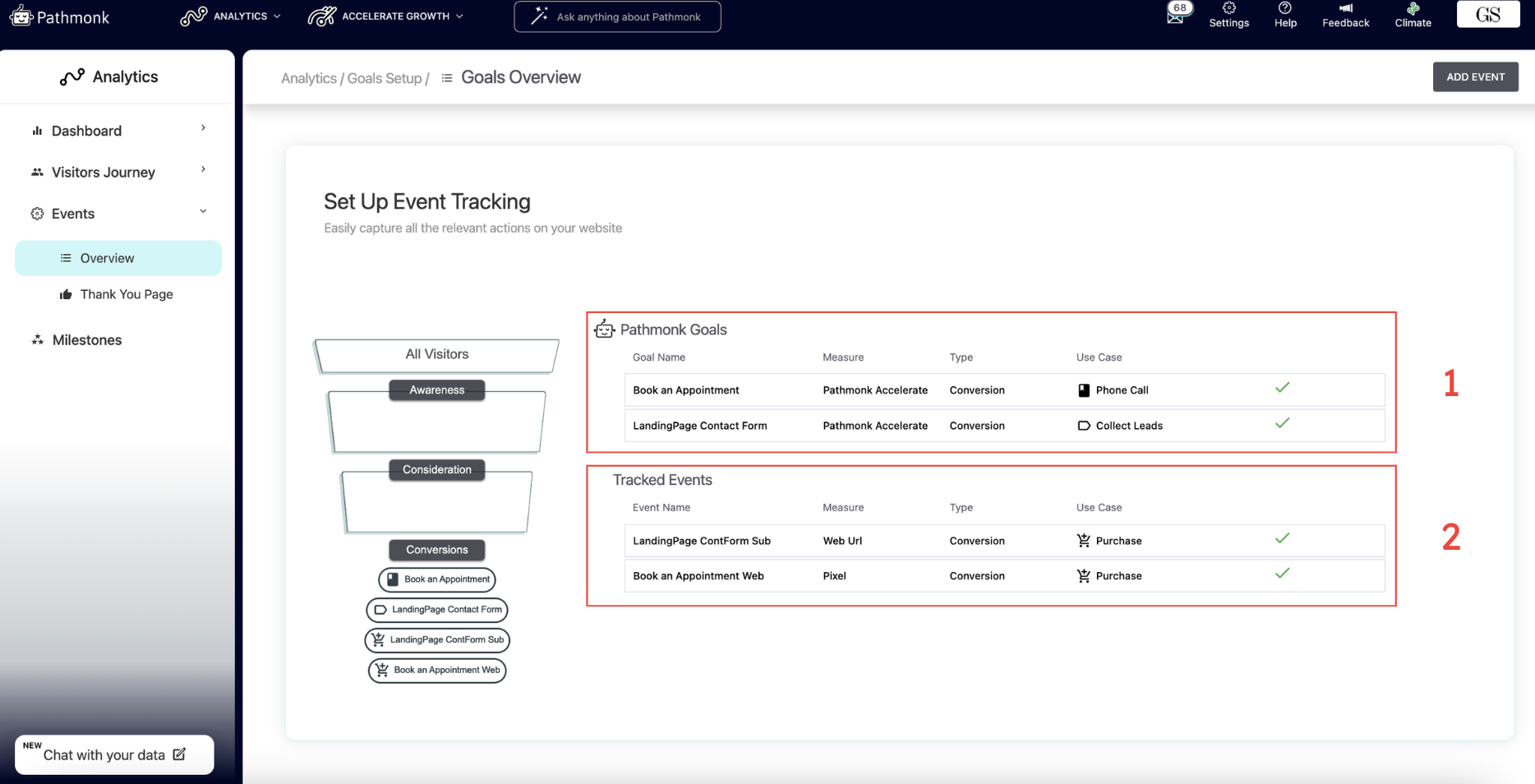 Understanding the difference between a conversion goal and a tracked event is key to setting up Pathmonk correctly and optimizing for meaningful results. You can review both by going to Analytics → Events → Overview, where you’ll find two sections: