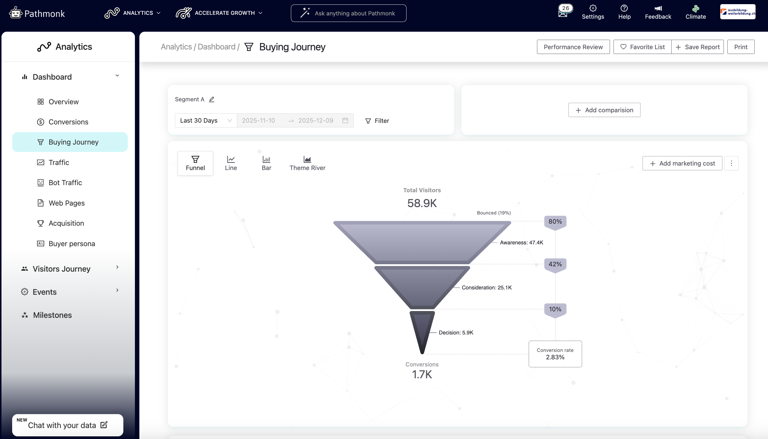 In the top-right corner, click Performance review to generate the two-funnel comparison: