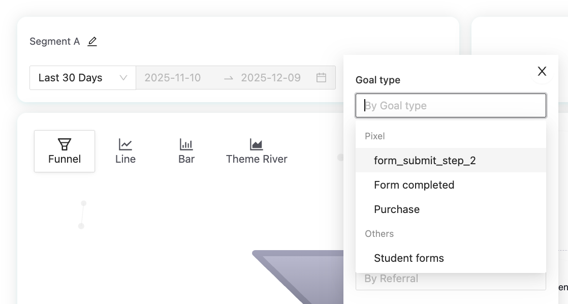 To focus only on real conversions, click Filter and select the tracked event(s) you want to measure. You can choose one or multiple. In this example, the customer wants to analyze completions of Step 2 of their form, so we’ll isolate the corresponding pixel event.