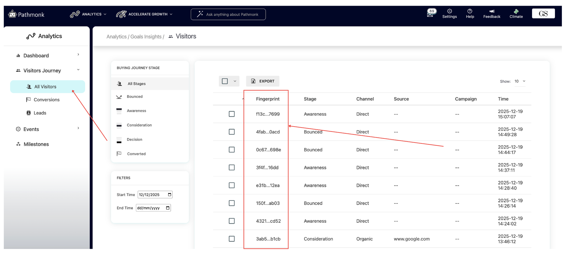 The fingerprint lets Pathmonk connect all interactions under a single ID. This avoids inflated visitor counts and gives you a true view of how users explore your site. Learn more about why Pathmonk data doesn't match other analytics sources.