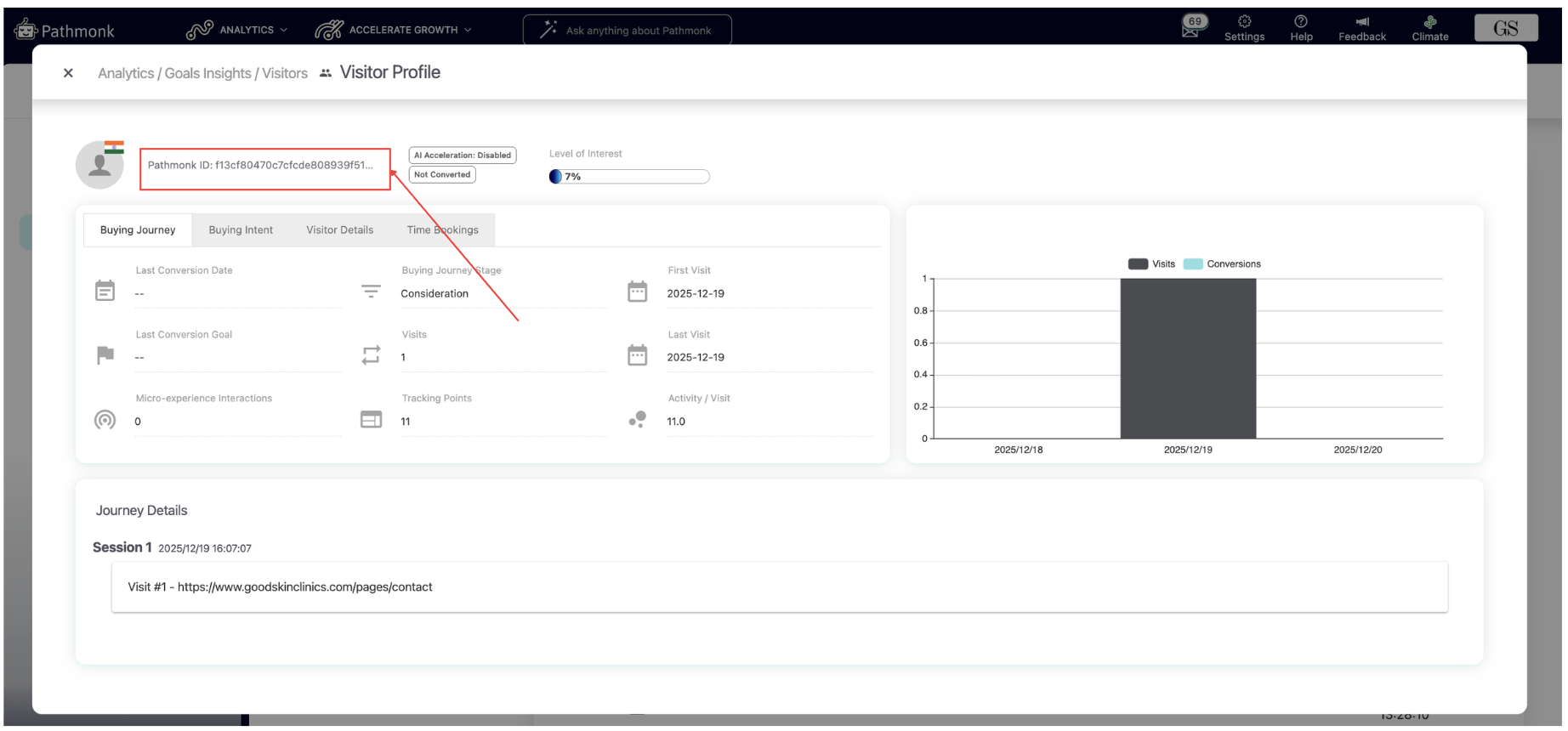 At the top of the card, you'll see the Pathmonk ID, which is the fingerprint assigned to this visitor. Regardless of whether they come back from a different device or browser, Pathmonk will try to match their new vector against the existing ones. If the system detects a high enough similarity between