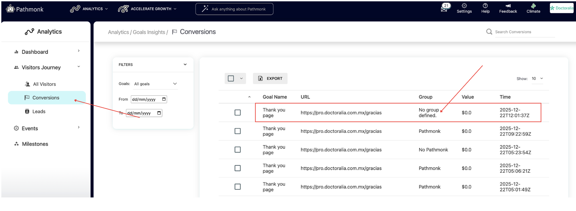 In Analytics → Visitors journey → Conversions, where it will appear as No group defined