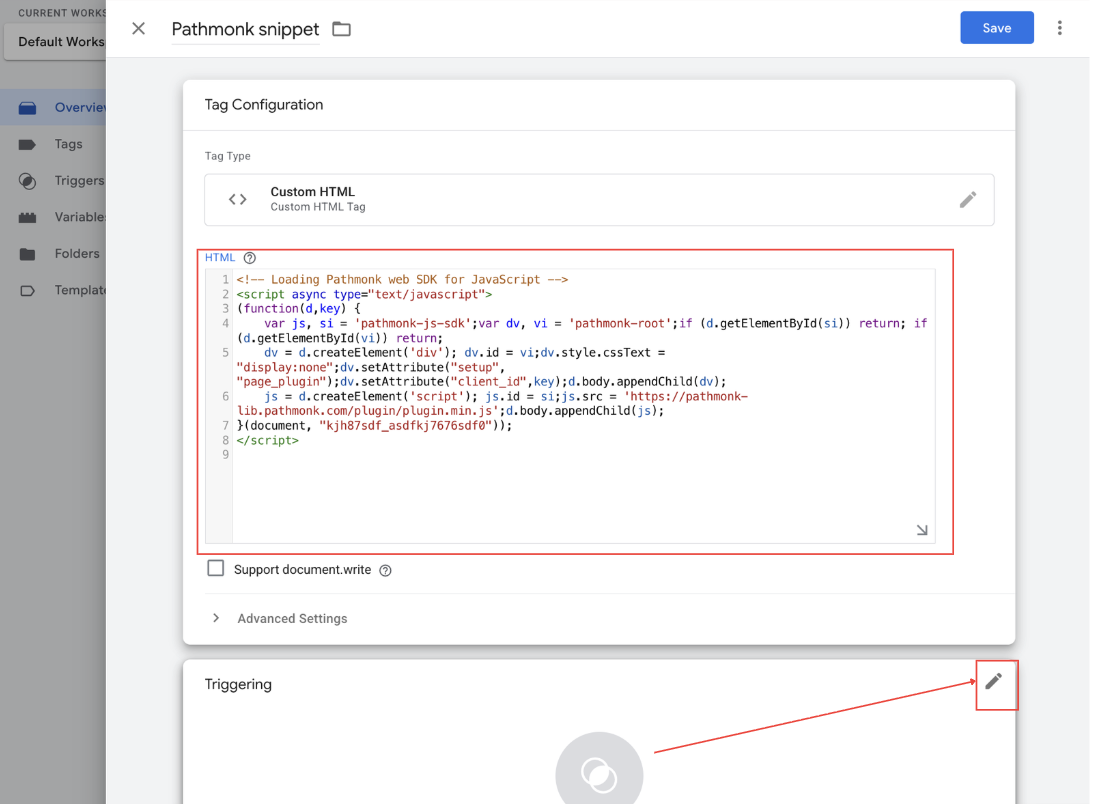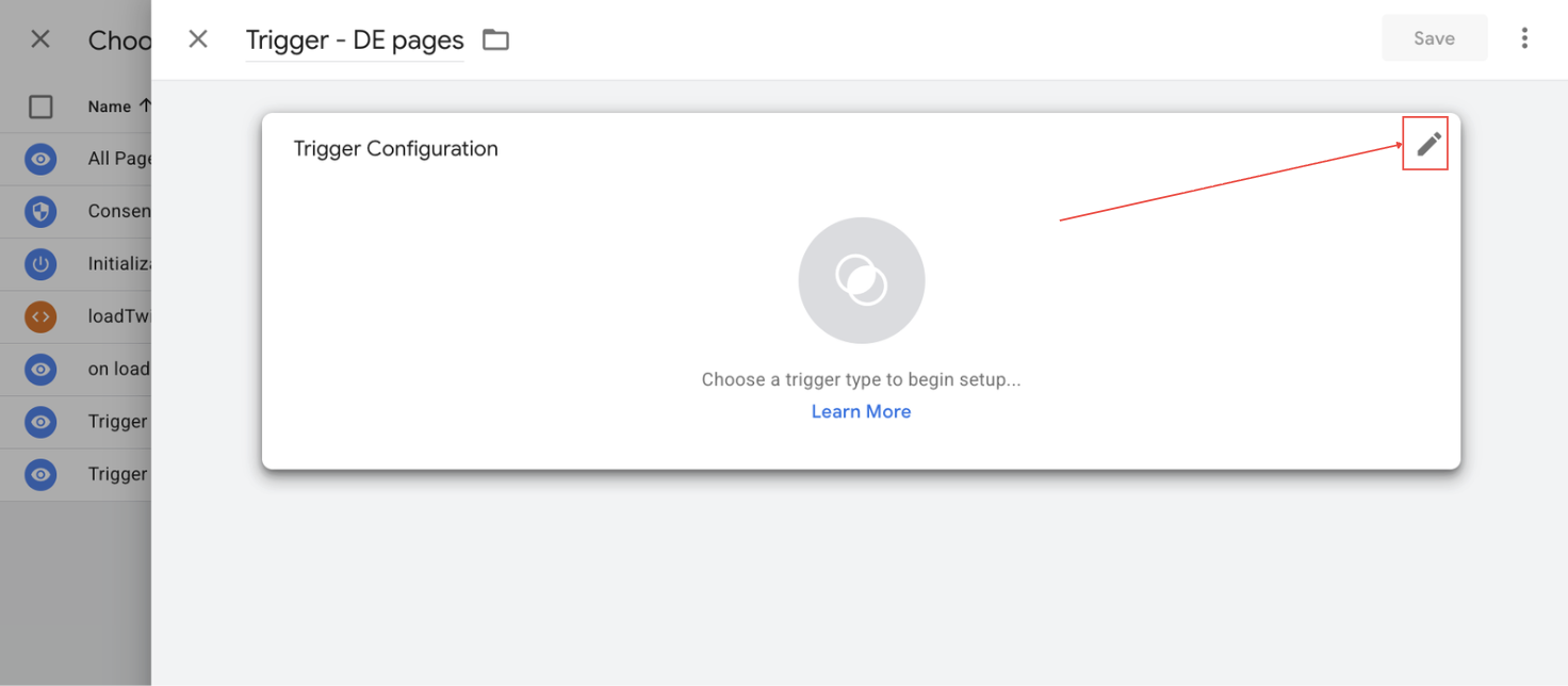 1. Once your tag code has been pasted, click on the pencil icon situated at the top right corner of the Triggering box